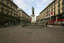 - π Via Dante. One of the grandest and most frequented fashionable high streets in Milan. The Via Dante, named after the poet, is a beautiful and debonair pedestrian avenue which goes from the busy Piazzale Cordusio, all the way to the Largo Cairoli, just in front of the city castle. With loads of street vendors, restaurant and cafe tables, and often, street art, glamorous boutiques and often bustling with people, it's great for anyone who wants to get to the Sforzesco Castle, but who also wants to do some high-class shopping, observe at some glorious Milanese palaces, and possibly sip at a coffee in one of the many open-air bars. It also contains the Piccolo Teatro, a renowned local theatre. At times, especially Christmas and some of the holidays, it can be chokingly filled with locals, shoppers and tourists.