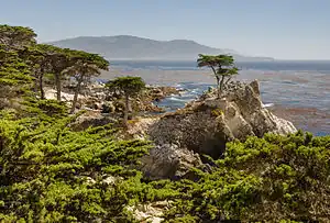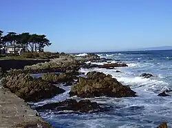 - Carmel - 5 mi (8.0 km) southwest of Monterey, Carmel is a beautiful oceanside town that is home to the historic Mission San Carlos Borromeo de Carmelo, several large beaches, excellent restaurants and an abundance of upscale lodging. It borders the iconic Pebble Beach golf course and is the entry point to the 17-mile drive and its dramatic ocean views.