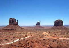 The buttes and mesas are not as common in Northern Monument Valley as they are in Eastern Monument Valley, but this simply makes them more dramatic. The Northern Monument Valley buttes are probably the one most easily recognizable feature of the whole valley. The end of Northern Monument Valley closest to the park headquarters was shown in the film Stagecoach. The Wildcat Trail goes around North Monument Valley's "mittens", which look like hands; the mittens are in Northern Monument Valley, but are close to Eastern Monument Valley.