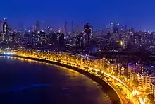 - 🌍 Marine Drive (Queen's Necklace, Netaji Subhash Chandra Bose Road). A 3.6-km-long C-shaped Promenade along the coast of a natural bay. The six-lane road connects Nariman Point on the south to Girgaon Chowpatty on the north. It is popularly known as the Queen's Necklace, because when viewed during the night, preferably from an elevated spot, the lights on the road resemble the string of pearls in a necklace. There are walkways and benches along the bay and is a favourite hunt for both tourists and locals. During weekend evenings the place gets very crowded. It is also the venue for several well-known events including the Mumbai Marathon and Indian Air Force (IAF) air show. Be careful and avoid this area during heavy rains.