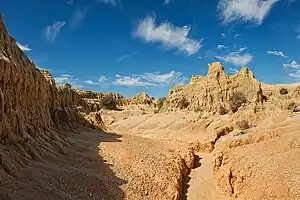 Lake Mungo (or Mungo Lake), the main lake in the park, is now dry. Sediments have been deposited here for over 120,000 years to form what's now known as the Walls of China were particularly prominent in the several thousand years after the lake dried up. However, European colonisation introduced sheep and rabbits that destroyed much of the vegetation that protected the sediments from erosion; the flip side is that the discovery of Mungo Man and Mungo Lady can be attributed to European settlement.