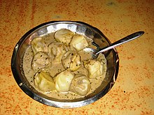 Some dishes, particularly in the Himalayan region, are Tibetan in origin and not at all spicy. Some dishes to look for include momos, a meat or vegetable filled dumpling, which is similar to Chinese pot-stickers. Momos has become very popular in past few decades. Momos can be found almost everywhere in Kathmandu and other towns in Nepal, whether it be a big hotel or a small restaurant. Other dishes like Tibetan Bread and Honey a puffy fried bread with heavy raw honey that's great for breakfast. Up in the Himalayan mountains, potatoes are the staple of the Sherpa people. Try the local dish of potato pancakes (rikikul). They are delicious eaten straight off the griddle and covered with dzo (female yak) butter or cheese.