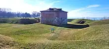 - π Fort Mississauga National Historic Site (the access path starts at the corner of Front and Simcoe streets). A fort on the shore of Lake Ontario, at the mouth of the Niagara River that was built from 1814β1816 during the War of 1812, to replace nearby Fort George. The remains consist of a boxβshaped brick tower and historic starβshaped earthworks. Niagara-on-the-Lake Golf Course surrounds the site, but public access is permitted via a walking path, with a warning to look out for golfers, who have the right of way. The interior of the blockhouse is closed, but has wooden staircases leading to some upper windows.