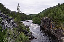 The E1, which has coincided with Nordkalottleden from Kautokeino enters Norway instead, for a more northern route via Goldahytta hut 3 km from the tripoint (Stordalen in the west was a refugee route during WW2, as there are plenty of hiding places; Finnish mobile phone coverage) and Gappohytta hut 14 km farther, below the 🌍 Paras fell (Sámi: Bárrás). The two trails meet again just before Rostahytta in Norway (12 km after Pältsa). The stretch where Nordkalottrutten does not follow other trails is only a few years old and not necessarily yet worn, follow markings and your map. Somewhat before Rostahytta, there is a high suspension bridge over Iselva ("ice river") – if you have acrophobia, beware.