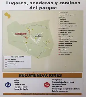 - 🌍 Reserva Natural del Bosque Mbaracayú (Mbaracayú Forest Nature Reserve), ☏ +595 21608741, +595 21608742, +595 983933161, [email protected]. A privately run reserve, accordingly the prices. Animals: jaguar, tapir, maned wolf, bush dog, neotropical otter, giant armadillo, caiman, and amphibians. numerous types of birds, butterflies and ants. Hiking/tours: Sendero Aguara´i, Sendero Arroyo Moroti, Tiro de fecha con los Ache, Paseo en Canoa, Visita Salto Karapa, Mirador del Patrullero Bruno. Lodging: single GS.250,000, double GS.450,000, triple 600,000, quad 770,000 (full board). Camping: GS.35,000 pp. Hiking/tours: GS.20-75,000. Transport: 150-500,000 per car.