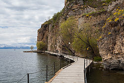 The east coast is the most beautiful part of Lake Ohrid. From the town of Ohrid in the north, down to Saint Naum Monastery is considered the Macedonian Riviera. The country is landlocked, but you're certain to forget that when visiting this breathtaking area. It forms the western side of Galičica National Park. Below are notable places of interest along the coast, listed going south from Ohrid.