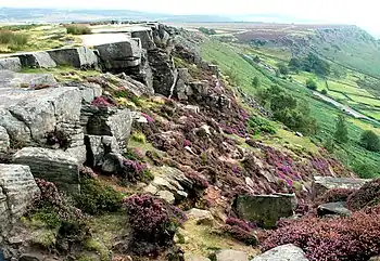 - East of Hathersage is the long scarp of Stanage Edge, good for walking and climbing, with Burbage Edge and Millstone Edge to the south on the boundary of Sheffield.