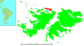 Pebble Island is in the northern portion of the Falkland Islands. The island is comprised of 22,000 acres and has a total length of twenty-four miles, making it the third largest offshore island in the Falklands. The eastern portion of the island is relatively flat and includes numerous small ponds, while the western portion of the island has several hills. This island was the site of a major battle during the 1982 conflict, and a memorial and the wreckage of Argentine aircraft can be viewed.
