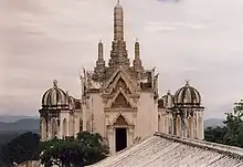 - There is a five-topped pagoda constructed in accordance with the Mahayana concept housing Buddha’s relics. The stucco designs decorated on the viharn and the ubosot reflect the skill of local craftsmen.