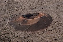 Most eruptions begin with lava fissures several hundred meters long emerging, from which lava flows evenly like waterfalls. Minutes to hours later the eruption starts concentrating in a few exit points, where lava is shot out at a more uneven pace. Lava that is propelled out with less force often spreads around a large area, but lava that is ejected high up in the air congeals and falls down forming cones known as pitons. Eruptions may involve multiple cycles of fissures and exit points.