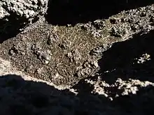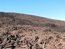 - ʻAʻā lava (Lave en gratons) is cooler (around 1,000°C), less runny, and flows slower. This type of lava often catches loose rocks along the way, and therefore looks like a plowed field. This name of the lava mimics the exclamation of someone walking barefoot over the cooled lava (with sharp edges).