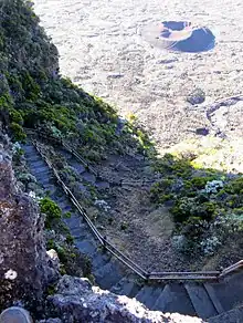 There is an entrance gate from the Pas de Bellecombe to a well-marked path, which occasionally turns into a staircase, down into the caldera.