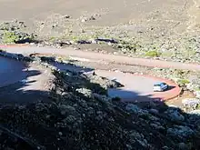 After a few kilometers the local road becomes a well-maintained forestry road, and in the final kilometers it becomes a well-maintained track. The road first goes through Alpine meadow landscape before it crosses the desolate volcanic landscape of Plaine des Sables, part of the outer caldera. There are several viewpoints along the route. Just before the parking lot, there's a road to the left leading to the Gite du Vulcan.