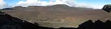 Inside it, delimited by cliffs ranging from 100 to 400 m in height, is the inner caldera, Enclose Fouqué. This flat plain, about 2,200 m above sea level, is almost completely devoid of vegetation and is dominated by volcanic rock and ashes from recent eruptions. It is shaped like a horseshoe with an opening to the east, and spans some 13 km from east to west and 9 km from north to south. In the middle of this moon landscape is the dome of the volcano, rising 400 m above the caldera floor and forming the summit of the volcano. The dome has a diameter of about 3 km and comprises two craters, Bory and Dolomieu: