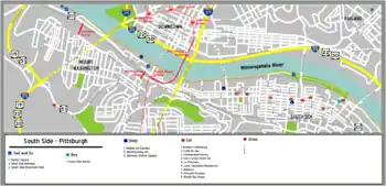 South Side is the southern region of Pittsburgh, south of the Monongahela and Ohio Rivers. While this article covers the entire southern region of the city, "South Side" usually refers to a popular neighborhood directly across the Monongahela River from Downtown.