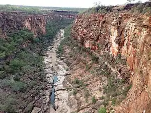 The park is 25 kilometres long and just a few kilometres wide, follows the course of Porcupine Creek and includes open woodland and grassland on both sides. The river has carved an impressive gorge averaging 120 metres deep through sedimentary rock hundreds of millions of years old. In the broad parts of the canyon, erosion has formed a pyramid over time, a solitary monolith of multicoloured layers of sandstone . This formation was only made possible by the fact that a thin but hard basalt layer formed over the sandstone five million years ago as a result of a lava flow formed, protecting the underlying soft rock. In places where this top layer had been removed, Porcupine Creek was able to dig deep into the sandstone. The deeper Permian sedimentary strata intersected in the canyon belong to the Galilee Basin and contain the coal beds of the Betts Creek Beds. The seams are explored outside of the park to see if they are worth building.