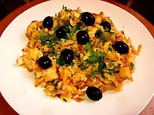 - Bacalhau à Brás is a dish of shredded salted cod, onions, and thinly chopped, matchstick-sized fried potatoes, all bound with scrambled eggs, garnished with black olives and fresh parsley.