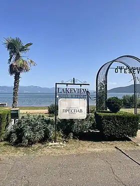 - 🌍 Lakeview Hotel and Resort (Oteševo), ☏ +389 47 551 195. This hotel has a private beach and one of the best views of the lake. It has a lot of amenities and seems to offer new things every summer. It also contains a nice restaurant. The popular Macedonian television series Prespav is set (but not filmed) here.