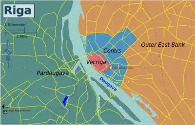 There are many administrative districts in Riga. However, almost all tourist attractions, historic buildings and hotels are contained within the borders of the relatively small and walkable Centra rajons district, which is made up of Vecrīga (the old town) and Centrs (the modern-day business district). However if you have already seen the more famous attractions in the city centre, the outer districts do have their own draws too.