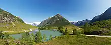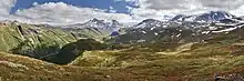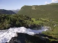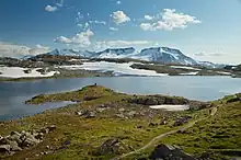 Road 55 is a 140-km regional route between Sogndal at Sognefjord and Lom in Oppland. The route runs through Sognefjellet mountain pass and the drive is simply called Sognefjellet by locals. The Sognefjellet is a mountain pass in central Norway, joining the Sognefjorden in the west with the Ottadalen branch of Gudbrandsdalen in the east. The route has been named one of 18 national scenic routes because of the varied landscape and fine scenery. Route 55 runs between the great western fjords and the wide eastern valleys, and runs through the steep slopes between fjords and high mountains, passed glaciers and alpine peaks, and along big valleys with powerful rivers. The route offers a shortcut between inner Sognefjord and eastern valleys in an area where overland transport is blocked by glaciers and wild mountains. Alternative drives are through Valdres or E39 through Stryn.