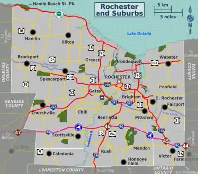 New York State Route 104 is a major east-west route and forms the northern part of the Outer Loop, although it's only an expressway on one side, from the river east. It's also the main feeder route from the northeast and northwest. New York State Route 531 is an expressway that feeds into I-490 on the west side of the county, south of 104.