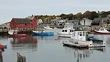 Rockport is a town of 7,000 people (2020) in Massachusetts on Cape Ann. The town, once famous for granite production, got its start as an artist colony in the late 1800s. Rockport is a favorite vacation spot and day trip for many who come to enjoy the concentration of shops and galleries on Bearskin Neck, the rugged, rocky coastline or some ultra-fresh lobsters or other seafood.