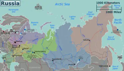 Russian Far East (Amur Oblast, Chukotka, Jewish Autonomous Oblast, Kamchatka Krai, Khabarovsk Krai, Magadan Oblast, Primorsky Krai, Sakhalin Oblast, Yakutia) One of the coldest regions in Russia, home to the coldest city in the world, Yakutsk. World-famous for national parks, beautiful scenery and mountains, and the volcanoes of Kamchatka. Also a gateway to North Korea and China. |