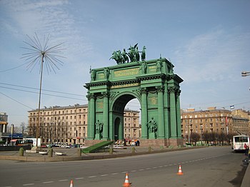 - 🌍 Narva Triumphal Arch (metro Narvskaya). The gates are installed in memory of the heroes of the Patriotic War of 1812, and inaugurated in 1834. The arch is 30 m high, decorated with figures of warriors and chariots of Fame. Architect: V.Stasov. In the upper part of the door is a museum which is a branch of the Museum of City Sculpture.