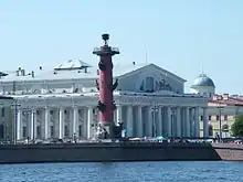 - The ensemble of the Spit (Strelka) of the Vasilievsky island was built in the early 19th century between the academic quarters and the port and is dominated by the Stock Exchange building. It offers an impressive view of the Neva river with the Hermitage and the Peter and Paul Cathedral. Other monuments you'll immediately notice on the Strelka, the Rostral Columns, are yet another symbol of the city. Constructed in 1810 to celebrate the victory over the Swedish navy, the columns are each adorned with six rostra (traditionally, the prows of captured ships), symbolizing the might of the Russian Baltic Fleet. At the base of the columns you'll see sculptures representing the great rivers of European Russia, the Volga, Dnieper, Neva, and Volkhov. In addition to their decorative purpose, the columns also served as lighthouses, and the gas flames are still lit on holidays.