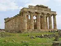 - π Temple F. This is the smallest temple with an area of 61,8 - 24,4 m (6 x 14 columns). It is assumed that the temple is devoted to Dionysos. It was built between 550-520 BC. The stones of the temple were used for other purposes after his collapse. Metopes of this temple are also housed in the Archaeological Museum of Palermo.