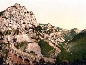 Semmering is the best known alpine resort in eastern Austria. In 1854 the Semmering railway was built, one of the first railways to pass through high alpine mountains. The spectacular landscape and the monumental buildings were declared UNESCO world heritage. The railway made it easily accessible from Vienna, and at the fin-de-siècle, several monumental hotels were built here. The Semmering railway was considered such an impressive feat of engineering that many other railways through mountainous terrain were nicknamed "Semmering of x", much like the Watergate scandal engendered the "-gate" suffix for scandals. As of 2020, a new base tunnel is being built for faster long distance trains, and to relieve freight trains of the costly and difficult need to have extra locomotives coupled to get across the steep sections. The old line will of course stay open, but international and freight traffic will move to the new line once it opens.