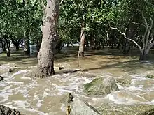 - 🌍 Bao'an West Bay Mangrove Forest Park (宝安西湾红树林公园) (several bus stops nearby; the closest is 西湾公园站. The nearest metro station is Bihaiwan 碧海湾 a couple of kilometers away). A park protecting an area of fascinating mangrove forest along the water, with some nice boardwalks and paved walking paths. There's an adjoining park to the north with a big sandpit which is fun for kids. It's not too big, but nice for an hour or so walking around, though the peaceful atmosphere is spoiled by the screeching noise of metro line 11 trains passing by and the sound of planes taking off from the airport. Avoid coming in the middle of the day—it gets hot. Free.