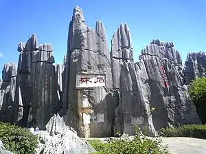 Shilin (石林, Shílín) karst region, the "Stone Forest", is a national park in Kunming Prefecture, Yunnan province in southern China. The huge pillars of stone, formed by erosion, look like something out of a fantasy film. The park is large, too big to see all of it in one day. It has several different areas and many interesting nooks and crannies, and you can easily lose yourself on the winding paths between the huge rocks.