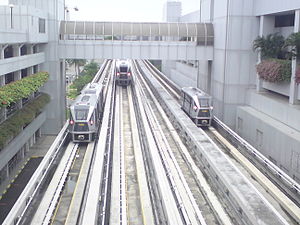 Changi Airport is the terminus of the East-West line of the Mass Rapid Transit (MRT) rail system. While cheap, the MRT is aimed squarely at commuters: there are no express services; the trains are regular commuter trains without baggage storage (although many of the train sets have handrails installed in place of seats in order to accommodate more standing passengers with luggage), and can get quite crowded during rush hour (mornings towards the city, evenings towards the airport). But if you're not in a rush, don't have too much luggage or are staying near a station, the train can still be worthwhile.