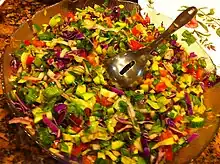 • Kachumber – this classic, everyday salad from Northern India contains the essential trio of chopped up cucumber, onions and tomatoes seasoned with salt, black pepper, cumin powder, red chilli powder. Green chillis and herbs like coriander and mint may be added. The dressing is either lemon or lime juice with no sugar or oil added. A similar salad from Afghanistan called Salata or Afghan salad usually has the same triad of vegetables with the addition of carrots and may contain other herbs such as parsley and dill.