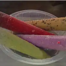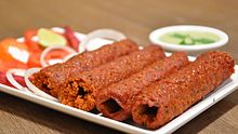 • Kati roll – a wrap invented in Kolkata which is made with a flaky and white flour version of paratha bread and filled with meat, egg or paneer along with onions, chutney and a squeeze of lime juice. The name derives from the Bengali word for bamboo stick of skewer, on which the kebab meat was traditionally cooked.