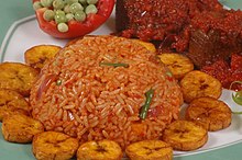 - Jollof rice – fried rice dish with tomatoes, red palm oil, onions and spices. The tomatoes and red palm oil gives the rice a deep reddish color.