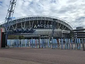 - π Stadium Australia (Accor Stadium), Cnr Olympic Boulevard & Dawn Fraser Ave, β +61 2 8765 2000, [email protected]. This Stadium was used for athletic events as well as the opening and closing ceremonies for the 2000 Olympic Games. Now it is used for a wide variety of sporting matches, including AFL, Rugby League (State of Origin and NRL), Rugby Union, and Football (A-League). It is also used for Stadium Concerts. There is also the art installation βGames Memoriesβ just outside the southern entrance, which is a which is a tribute to the volunteers of the 2000 Olympic and Paralympic Games.