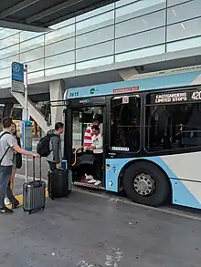Two public bus routes operate from both terminal precincts. The 400 and 420 buses run to other train stations with connections into the City, and using either bus then transferring onto a train avoids the airport station access fee. The 400 runs towards Bondi Junction, and the 420 runs towards Burwood. If you have a contactless credit or debit card then there is no need to pre-purchase a ticket, simply tap your card onto the Opal card reader when boarding and then tap off when leaving the bus.