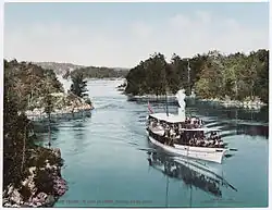 Passenger rail came to Gananoque in 1856 and to Clayton in 1873. Multiple steamboats left Clayton's docks for elaborate hotels on various islands. At the turn of the 20th century, the Thousand Islands were mainly a retreat for the wealthy, some of whom bought a private island for their summer mansion. Dubbed Millionaire's Row, these lavish homes are visible by taking a boat cruises down the river. For New York City's elite in 1874β1912, the region was close enough to be readily accessible by train and steamship but distant enough to be a welcome break from city life of the era. A similar pattern took place in the Adirondacks, where rail transport from Albany and New York City brought the well-to-do in search of waterfront sites to construct "Great Camps" as a luxury of their era.