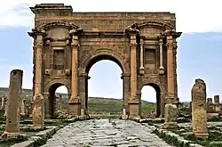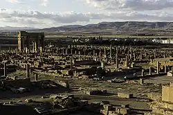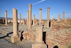 Timgad is a town as well as the ruins of a Roman city in Northeast Algeria. The ruins are a UNESCO World Heritage Site. Timgad lies on the northern slopes of the Aurès mountains and was created as a military colony by the Emperor Trajan in 100 AD. It is an excellent example of the grid plan as used in Roman town planning.