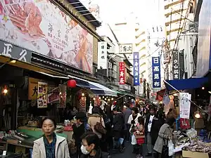 • 🌍 Tsukiji Outer Market (築地場外市場 Tsukiji jōgai shijō), 5-2-1 Tsukiji (Tsukijishijo Station, Toei Oedo Subway), +81 3-3542-1111. Varies by shop, but typically M-Sa 09:00-14:00, closed holidays and most Wednesdays. For more than 80 years, Tsukiji was the world's largest wholesale fish market. Although the wholesale operations (including the famous tuna auctions) closed in 2018 and moved to Toyosu, the outer market remains in place and continues to welcome the public with stalls selling fresh fish, sushi, produce and kitchen supplies. Suggested plans for the former inner market site include a sport stadium or an anime/manga themed entertainment facility. Free.