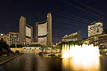 The heart of downtown Toronto with Yonge St, the Eaton Centre, theatres and City Hall.