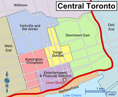 The dense urban core of Toronto. It includes many of the city's attractions and hotels.