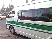 Route taxis are shared and are simply normal passenger cars with no special markings. However, their license plates start with the letter "H". They are found at Taxi stands which may be at a street corner or at the side of the road. Taxi stands in the cities and boroughs are usually marked, but outside of the city they are not. However, one can hail a taxi from the side of the road and ask where they are going and the fare before hiring the taxi. One pays for an individual seat and the taxicabs are shared, but a whole car can be hired if so desired, and if there are not a lot of passengers waiting. Airport taxis are an exception to this in that one almost always has to hire the whole car.