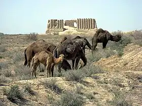Camels grazing in front of Great Kyz Kala, Merv