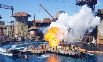 - 🌍 Waterworld — An elaborate stunt show based on the film Waterworld. While the film has a reputation for being underwhelming, the show is much more highly regarded, with lots of stunt actors, pyrotechnics, and water effects, as well as an explosive plane crash. The arena seating is split up so that seats closest to the stage get soaked while those further away stay dry.