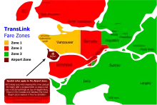 TransLink's SkyTrain (Canada Line) provides direct service to downtown Vancouver in 25 minutes. The fare from YVR to Vancouver is $9.65 (July 2024), which includes the two-zone base fare of $4.65 plus a $5 surcharge (the "YVR AddFare") incurred only for departures from the airport. Bus N10 runs overnight to Vancouver when the Skytrain service is closed. Route C92 connects the South Terminal with Bridgeport station on the Canada Line during limited daytime hours.