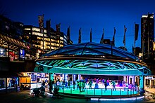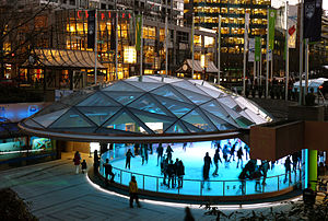 - π Robson Square, 800 Block, Robson St (Robson & Howe St). Both an office building and public space designed by Vancouver architect Arthur Erikson, it houses the Provincial Courts and a satellite UBC campus. The building, which was built to represent a skyscraper on its side, is noted for its use of water and greenery and is mostly underground. The public space features a skating rink underneath Robson Street, which is the only outdoor rink in Vancouver. Skating is available during winter and is free, skate rentals are $3.Ice skating at Robson Square during the winter