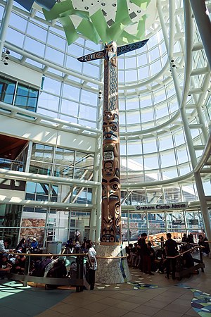 - Do not miss the totem pole at the escalators between the domestic and international check-in areas, in which motives from the Haida tribes, symbolized by the Creator Raven at its top and a man at the bottom are combined in harmony with Celtic and Asian elements.